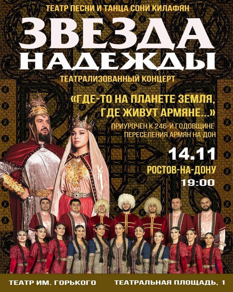 Դոնի Ռոստովում նոյեմբերի 14-ին կներկայացվի «Երկիր մոլորակի վրա ինչ-որ տեղ, որտեղ հայեր են ապրում» թատերականացված համերգը: Սոնյա Կիլաֆյանի ղեկավարությամբ «Հուսո աստղ» երգի-պարի թատրոնի միջոցառումը նվիրված է Դոնի Ռոստովում հայերի վերաբնակեցման 246-ամյակին: