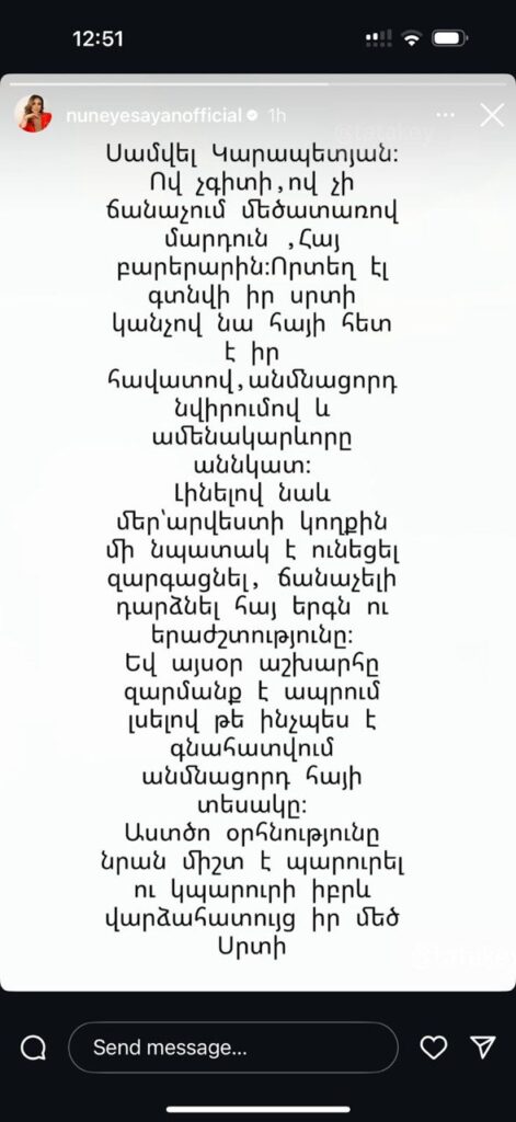 Հայտնի երգչուհի Նունե Եսայանն իր աջակցությունն է հայտնել գործարար, բարերար Սամվել Կարապետյանին՝ ինստագրամյան «story» բաժնում գրելով․