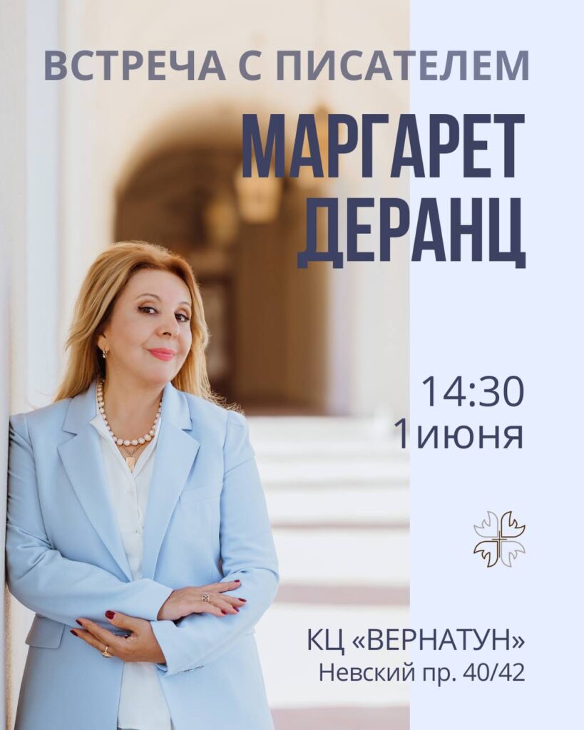 Հունիսի 1-ին Սանկտ Պետերբուրգի «Վերնատուն» մշակութային կենտրոնում կկայանա հանդիպում ամերիկաբնակ հայ գրող Մարգարիտ Դերանցի հետ։ Այս մասին հայտնում է Սանկտ Պետերբուրգի Հայ Առաքելական եկեղեցու «Նոր Սերունդ» երիտասարդական կազմակերպությունը։
