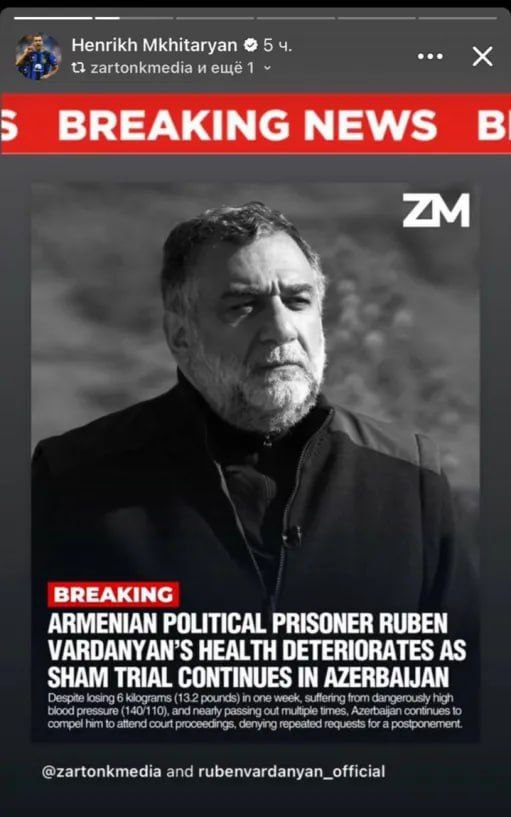 Հայաստանի ֆուտբոլի հավաքականի նախկին ավագ և Միլանի «Ինտեր»-ի կիսապաշտպան Հենրիխ Մխիթարյանն իր աջակցությունն է հայտնել Բաքվում ապօրինի պահվող Ռուբեն Վարդանյանին: