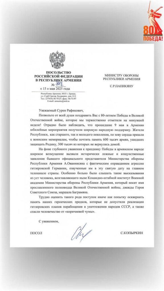 «Թույլ տվեք ի սրտե շնորհավորել ձեզ Հայրենական մեծ պատերազմում Հաղթանակի 80-ամյակի առթիվ, որը մենք հանդիսավոր կերպով նշեցինք անցյալ շաբաթ: Ուրախալի էր տեսնել, որ մայիսի 9-ին Հայաստանում անցկացված հոբելյանական միջոցառումները լայն հասարակական աջակցություն ստացան: Հանրապետության բնակիչները՝ թե՛ ավագ, և թե՛ երիտասարդ սերնդի, իրենց սրտի կանչով այցելել են զինվորական հուշակոթողներ՝ հարգելու հայրենիքը պաշտպանելու մեկնած 600 հազար հայերի հիշատակը, որոնցից 300 հազարը տուն չեն վերադարձել: