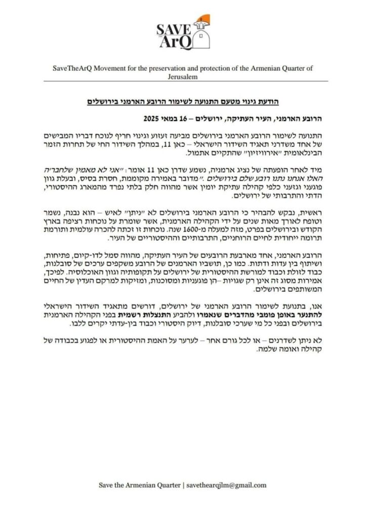 «Սա մտահոգիչ, անհիմն, ռասիստական և վիրավորական հայտարարություն է, որն ուղղված է Երուսաղեմի պատմական, կրոնական և մշակութային կառույցի անբաժանելի մաս կազմող հնագույն համայնքին: Նախ ուզում ենք ճշտել, որ Երուսաղեմի հայկական թաղամասը ոչ մեկին «չի հանձնվել»։ Այն կառուցվել, պահպանվել և զարգացել է դարեր շարունակ հայ ժողովրդի կողմից, որն իր շարունակական ներկայությունն է պահպանում սուրբ հողում և Երուսաղեմում ավելի քան 1600 տարի: Այս ներկայությունը ճանաչված է ամբողջ աշխարհում և եզակի ներդրում է քաղաքի հոգևոր, մշակութային և պատմական կյանքում», — ասվում է «SavetheArQ» շարժման հայտարարության մեջ: