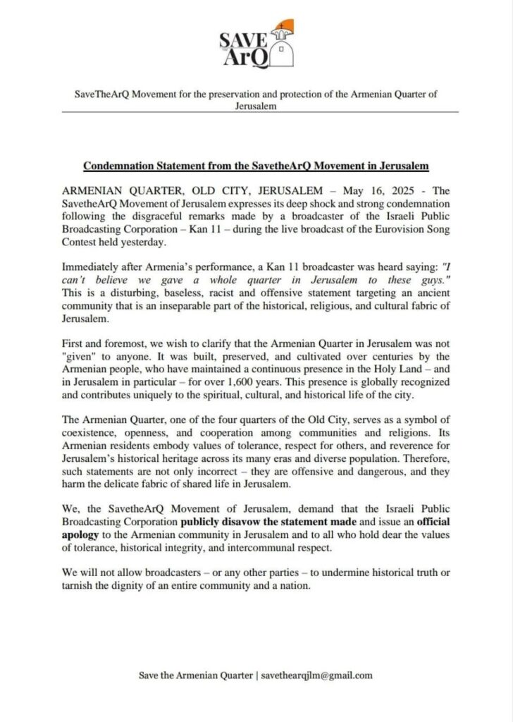 Շարժումը կոչ է արել Իսրայելի հանրային հեռարձակող կորպորացիային հրապարակայնորեն հերքել արված հայտարարությունը և պաշտոնապես ներողություն խնդրել Երուսաղեմի հայ համայնքից: