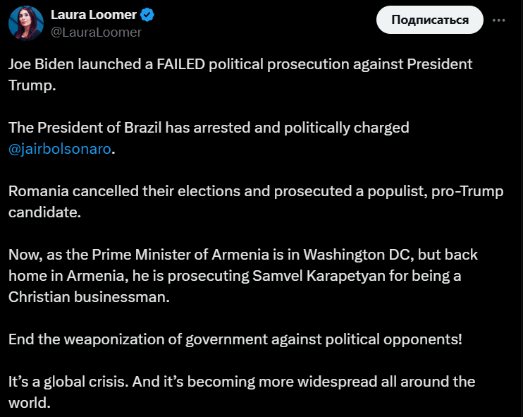 Ամերիկացի քաղաքական ակտիվիստ Լորա Լումերը, որը հայտնի է Դոնալդ Թրամփին աջակցելով և նրա վարչակազմում կադրային որոշումների վրա ազդելով, իր միկրոբլոգում անդրադարձել է հայ գործարար Սամվել Կարապետյանի ձերբակալությանը: