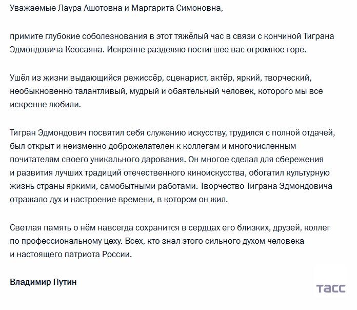 Պուտինը ցավակցություն է հայտնել Տիգրան Քեոսայանի մահվան կապակցությամբ