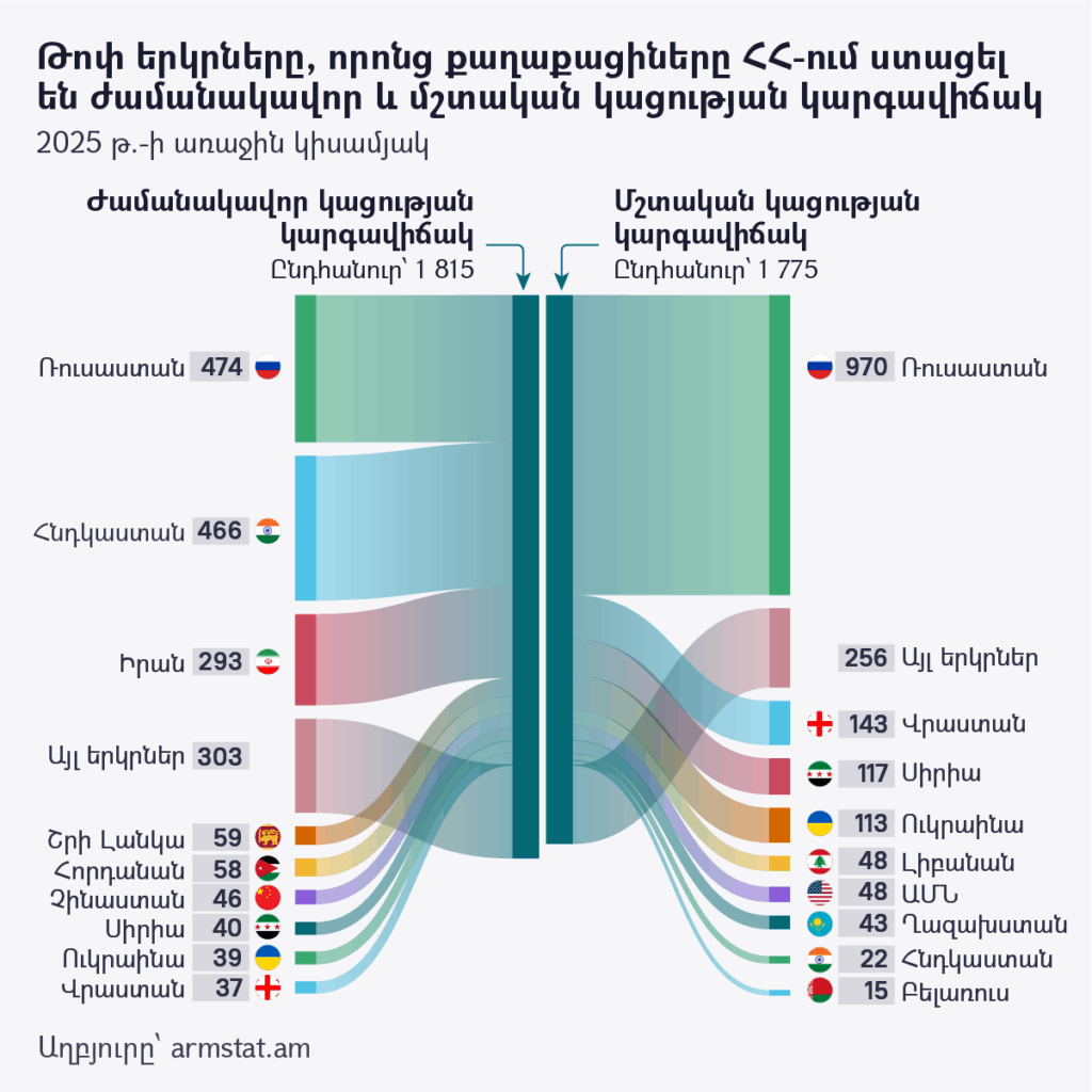 Հայաստանում 2025 թվականի առաջին կիսամյակում ժամանակավոր կացության կարգավիճակ է ստացել 1․815 մարդ, իսկ մշտական բնակության կարգավիճակ՝ 1․775 մարդ։
