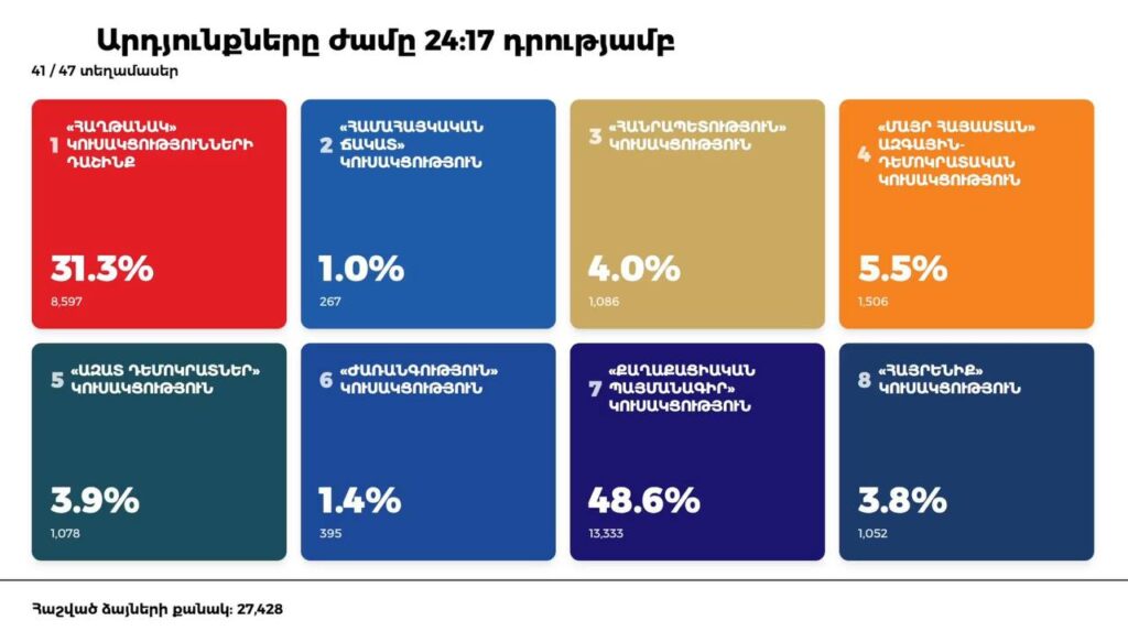 ՔՊ–ն չի հաղթահարում 50+–ի շեմը 17 Նոյեմբերի 2025, 00:24 Քաղաքականություն Վաղարշապատի ավագանու ընտրություններում ՔՊ–ն չի հաղթահարում 50+–ի շեմը։ Վաղարշապատի 41 տեղամասից ստացված նախնական տվյալները հրապարակել է «Պառլամենտարիզմի զարգացման միջազգային կենտրոն»-ը։