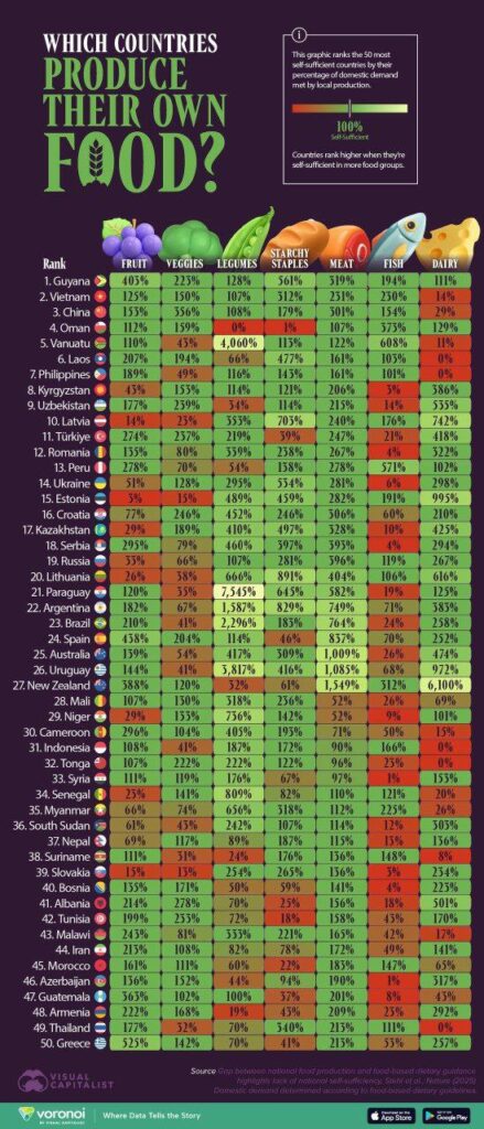 Армения вошла в число 50 наиболее продовольственно самодостаточных стран мира, согласно исследованию, опубликованному в мае 2025 года в журнале Nature Food. Эксперты проанализировали уровень внутреннего производства в 184 странах по семи основным категориям продуктов: фрукты, овощи, бобовые, крахмалистые продукты, мясо, рыба и молочные изделия.