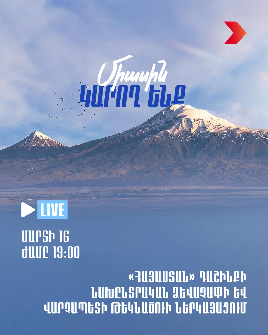 16 марта 2026 года в 19:00 в Спортивно‑концертном комплексе имени Карена Демирчяна состоится торжественное мероприятие блока «Армения», в ходе которого будет представлен формат участия объединения в предстоящих выборах. Также будет представлено имя кандидата на пост премьер-министра от блока и озвучен официальный лозунг объединения.