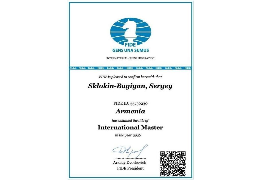 ФИДЕ присвоила Сергею Склокину-Багияну звание международного мастера 21 апреля 2026, 17:30 Спорт ФИДЕ присвоила юному шахматисту Сергею Склокину-Багияну звание международного мастера (IM). 21 марта этого года Сергей сменил свой флаг в ФИДЕ на армянский и теперь выступает под флагом Армении.