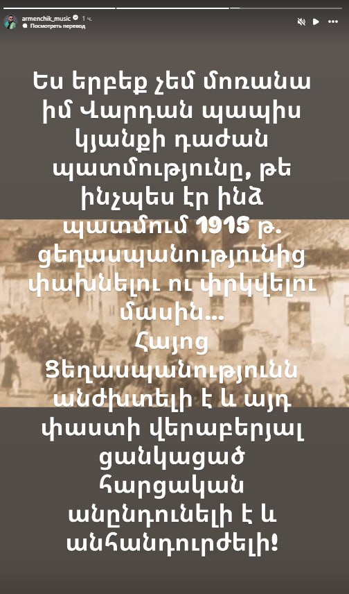 «Я никогда не забуду жестокую историю жизни моего деда Вардана, как он рассказывал мне о бегстве и спасении от Геноцида 1915 года … Геноцид армян неоспорим, и любые сомнения по этому поводу неприемлемы и недопустимы», — написал певец Арменчик в своих соцсетях.