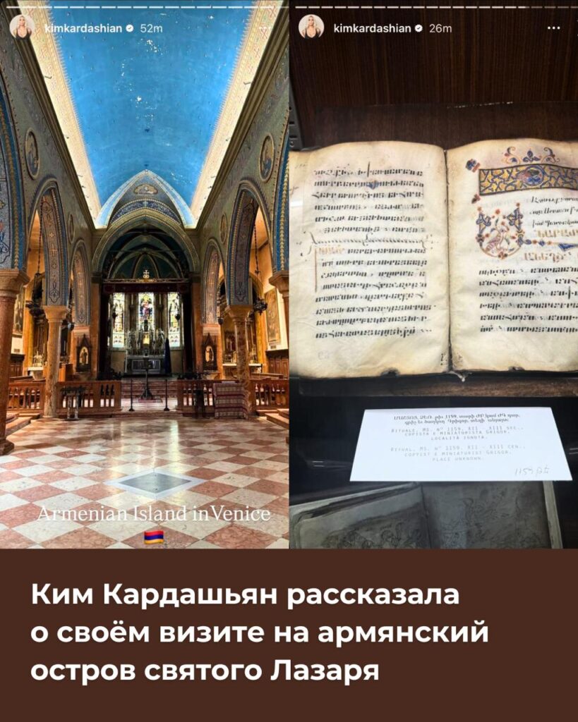 В первый день своего пребывания она отправилась на остров святого Лазаря – уникальное место, считающееся важным центром армянской культуры. Этот живописный остров, расположенный в южной части Венецианской лагуны, произвёл на Ким сильное впечатление. Она поделилась с подписчиками яркими фотографиями, запечатлевшими атмосферу и архитектуру острова.