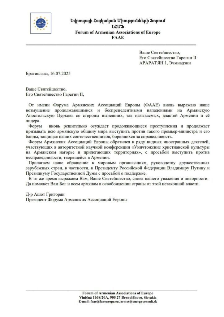 Президент Форума Армянских Ассоциаций Европы Ашот Григорян направил Его Святейшеству Католикосу Всех Армян Гарегину II официальное письмо, в котором осудил давление на Армянскую Апостольскую Церковь со стороны армянских властей. В письме говорится о незаконных арестах духовенства, атаке на Первопрестольный Святой Эчмиадзин и попытке подготовить арест самого Католикоса.