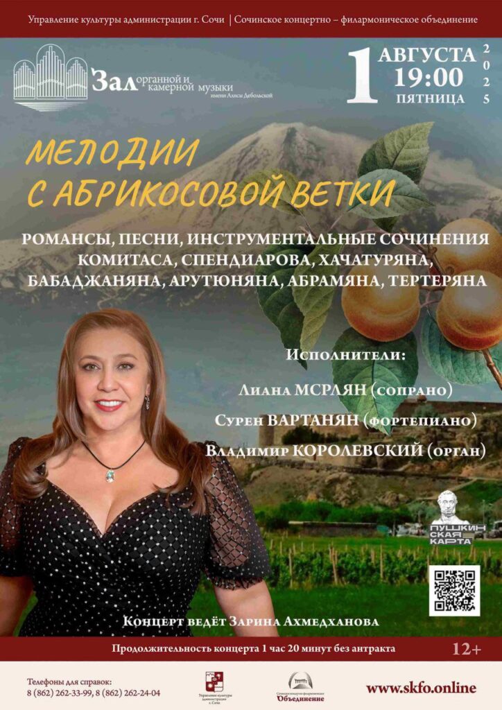 1 августа в зале Органной и Камерной музыки Сочи состоится атмосферный вечер, наполненный армянской музыкальной душой. Концерт «Мелодии с абрикосовой ветки» объединит яркие голоса и виртуозную игру исполнителей: сопрано Лиану Мсрлян, пианиста Сурена Вартаняна и органиста Владимира Королевского.