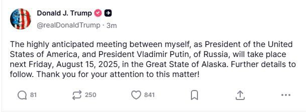 «Долгожданная встреча между мной, президентом Соединенных Штатов Америки, и президентом России Владимиром Путиным состоится в следующую пятницу, 15 августа 2025 года, в великом штате Аляска. Подробности будут опубликованы позже. Благодарю вас за внимание к этой теме!», — написал Трамп.
