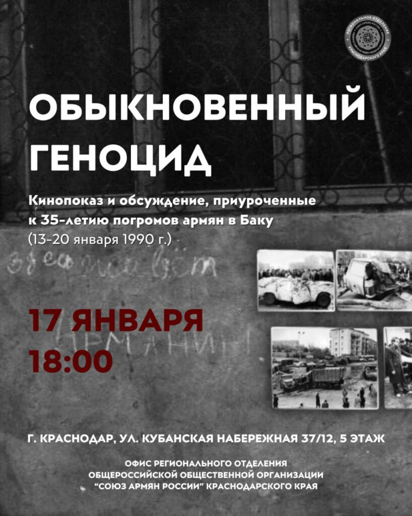 17 января в Региональном отделении Союза армян России Краснодарского края состоится показ документального фильма «Обыкновенный геноцид», приуроченный к 35-летию погромов армян в Баку.