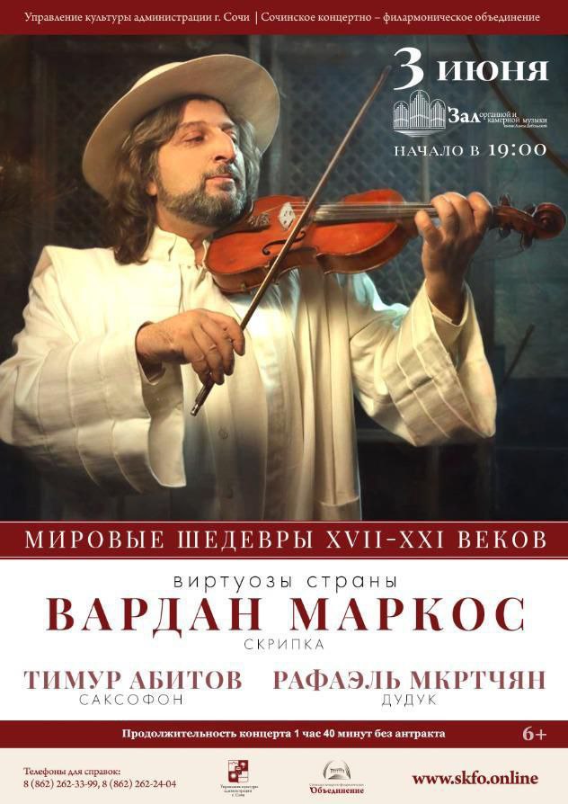 3 июня на сцене органной и камерной музыки им. А. Дебольской в Сочи состоится концерт скрипача-виртуоза Вардана Маркоса.