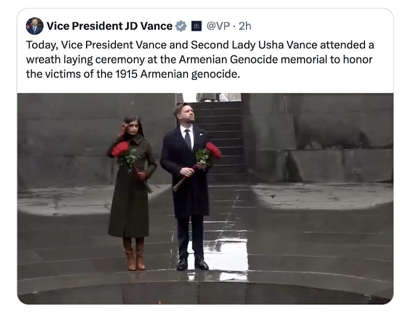 Вице-президент США Джей Ди Вэнс удалил из своего аккаунта в соцсети X пост о визите в Мемориальный комплекс «Цицернакаберд», в котором дважды упомянул термин «Геноцид армян». Пост оставался на странице несколько часов, после чего был удален.