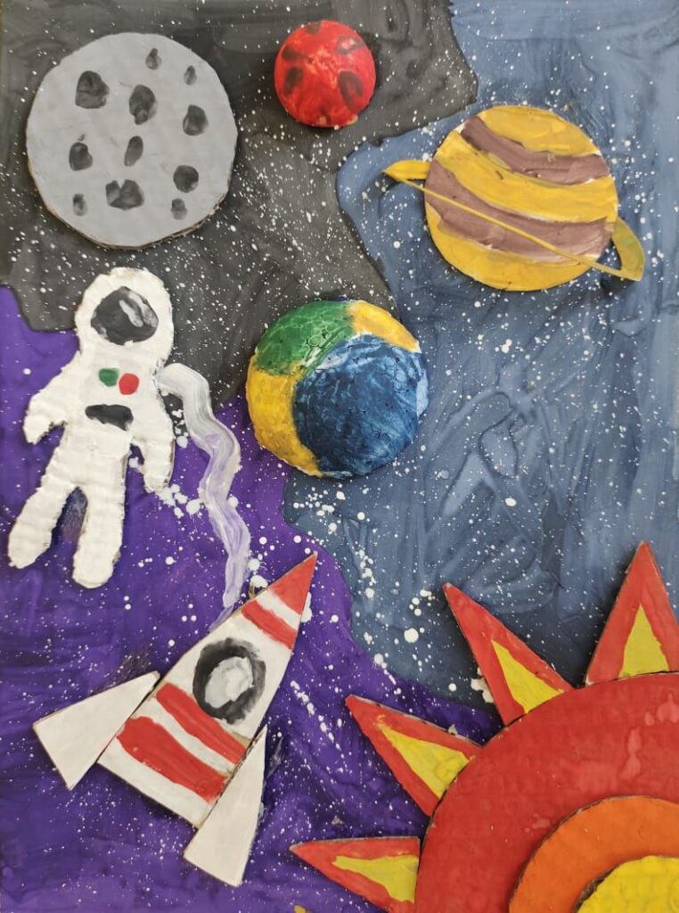 Սամվելի նկարում պատկերված է տիեզերանավ, որը հատում է տիեզերքի աստղային տարածությունը, և տիեզերագնաց բաց տիեզերքում՝ մոլորակների մեջ: