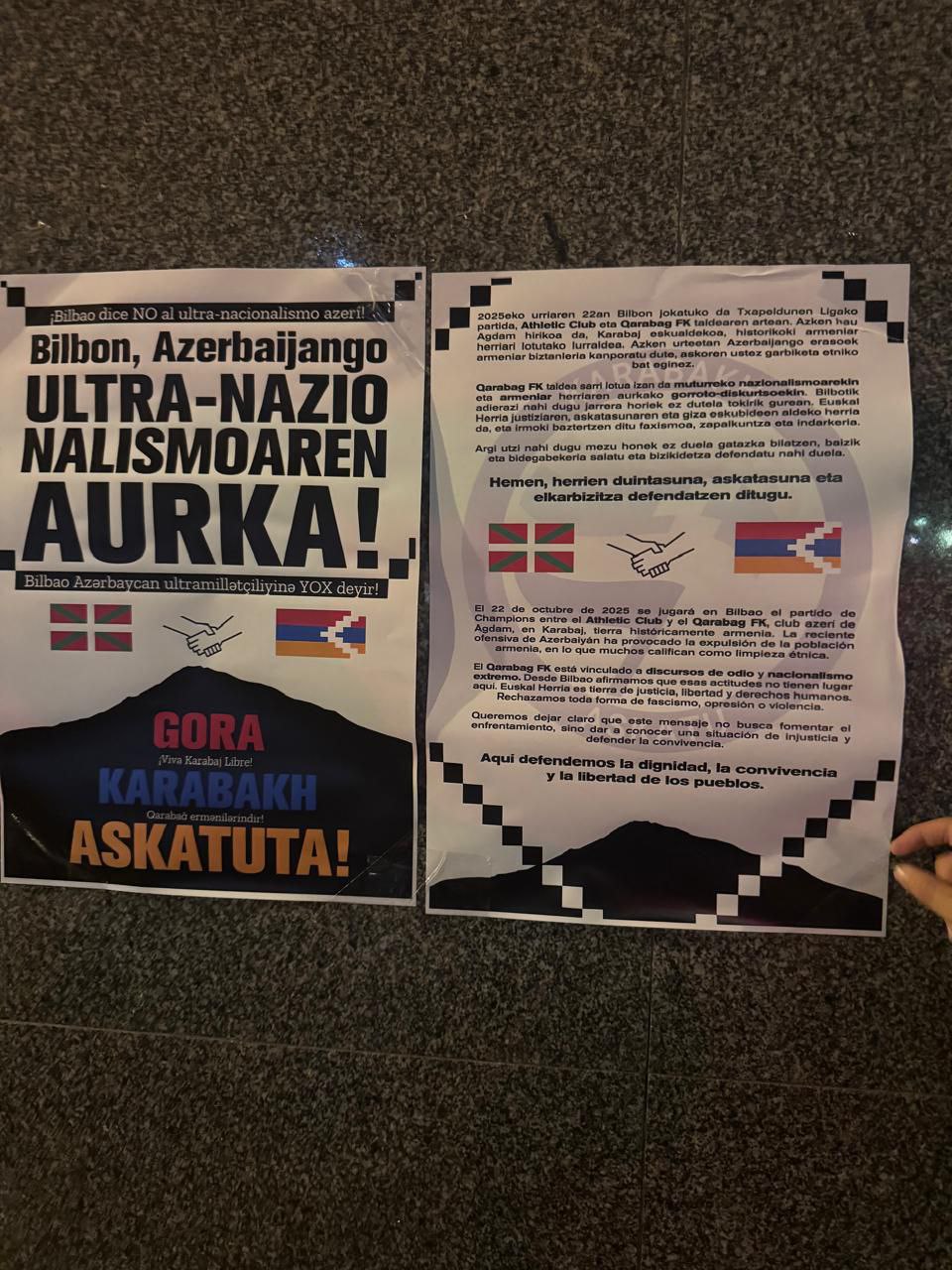 22 Հոկտեմբերի 2025, 21:23 Բիլբաոյում անհայտ անձինք հակաադրբեջանական թռուցիկներ են փակցրել Բիլբաոյում, որտեղ այսօր տեղի կունենա «Ատլետիկ»-ի և «Ղարաբաղ»-ի միջև Չեմպիոնների լիգայի խաղը , անհայտ անձինք հակաադրբեջանական թռուցիկներ և պիտակներ են փակցրել, գրում են…