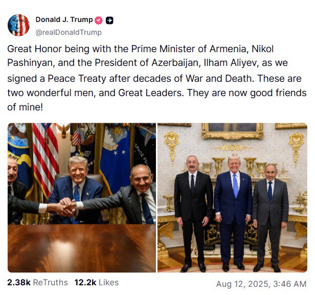 ԱՄՆ նախագահ Դոնալդ Թրամփը «Truth» սոցիալական ցանցի իր էջում անդրադարձել է օգոստոսի 8-ին Վաշինգտոնում վարչապետ Նիկոլ Փաշինյանի և նախագահ Իլհամ Ալիևի հետ տեղի ունեցած հանդիպմանը։