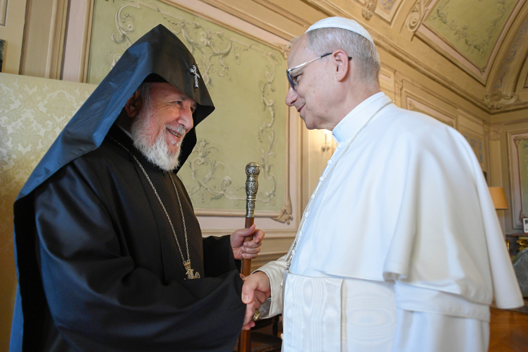 Վեհափառ Հայրապետը գոհունակությամբ անդրադարձավ, որ երկու Եկեղեցիների միջև եղբայրական կապերն ամրապնդվել են շնորհառատ հանդիպումների և հավատքի համատեղ վկայությունների միջոցով՝ հիշելով երջանկահիշատակ Սուրբ Հովհաննես Պողոս Երկրորդ Պապի այցելությունը Հայաստան 2001 թվականին, ապա 2016 թվականին երջանկահիշատակ Ֆրանցիսկոս Պապին Սուրբ Էջմիածնում հյուրընկալելու բարեպատեհ առիթը «այց առաջին քրիստոնյա երկիր» խորագրով ուխտագնացության կապակցությամբ: Հայոց Եկեղեցու և Հռոմի Կաթոլիկ Եկեղեցու փոխհարաբերությունների հիշարժան հանգրվաններից Նորին Սրբությունը նկատեց 2015 թվականին Հայոց ցեղասպանության հարյուրերորդ տարելիցի կապակցությամբ Սուրբ Պետրոսի տաճարում մատուցված սրբազան Պատարագը և Հայոց Եկեղեցու մեծագույն սրբերից Գրիգոր Նարեկացու հռչակումը որպես Տիեզերական Եկեղեցու վարդապետ։